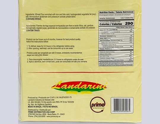 Farinha de trigo especial enriquecida com ferro e ácido fólico, banha, sal, glutamato monossódico e conservante Sorbato de Potássio.